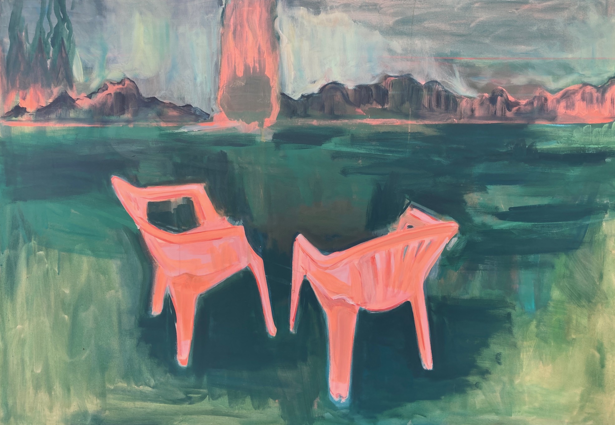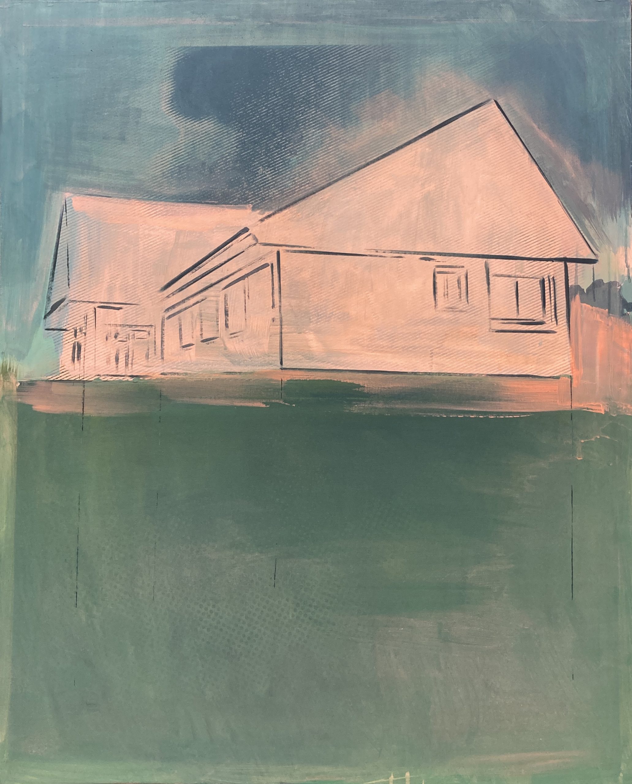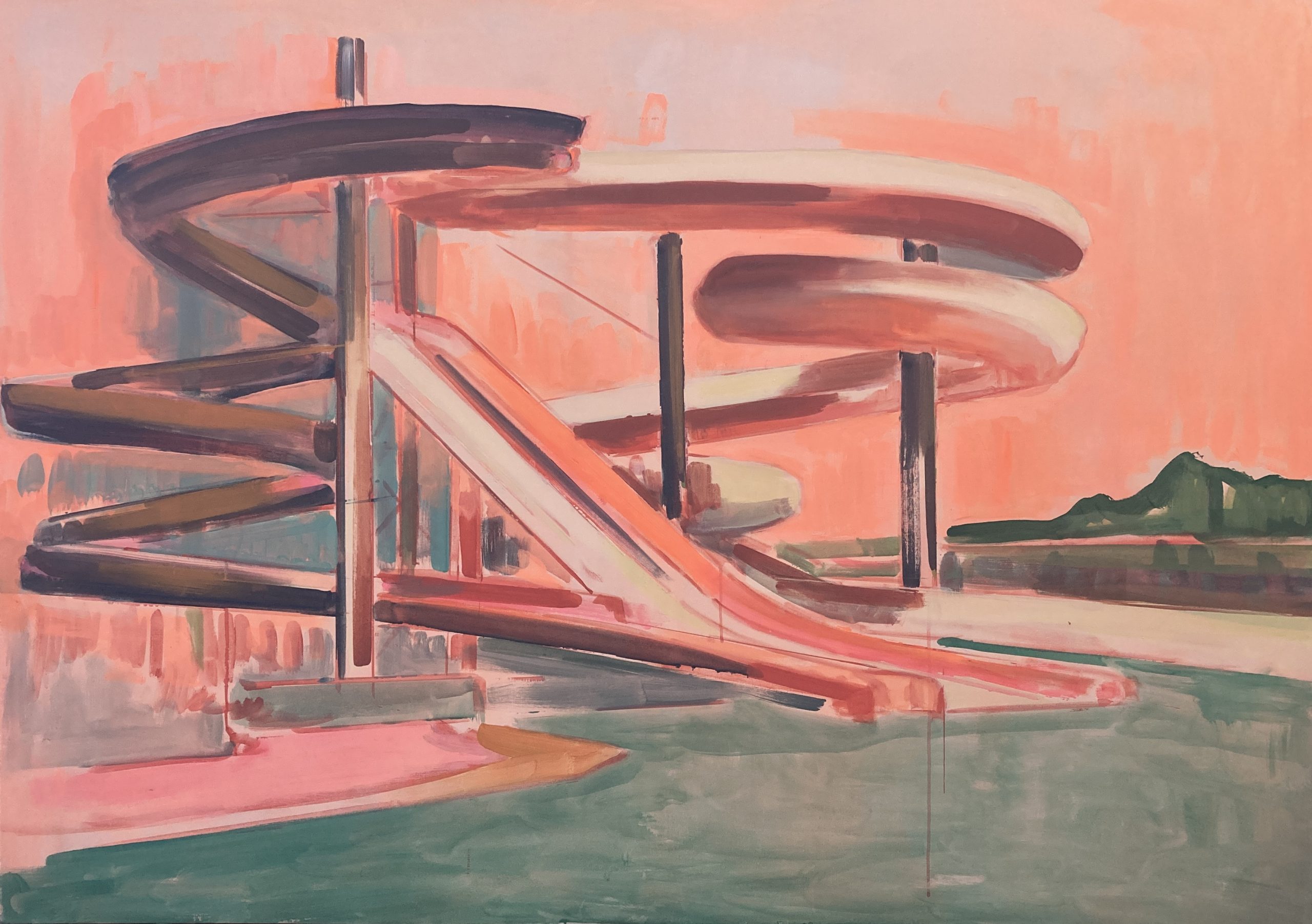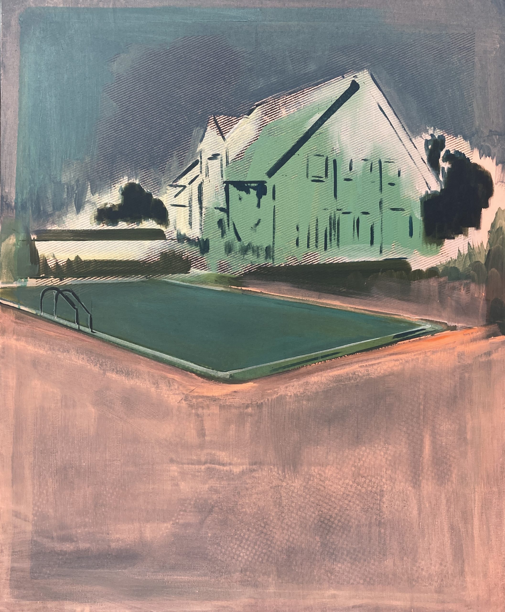 En peinture je mets en avant des lieux communs, je construis des « hétérotopies », sorte d’espaces concrets qui hébergent l’imaginaire, des lieux autres aux abords des villes, et qui ont leur fonction et leur temporalité propres.