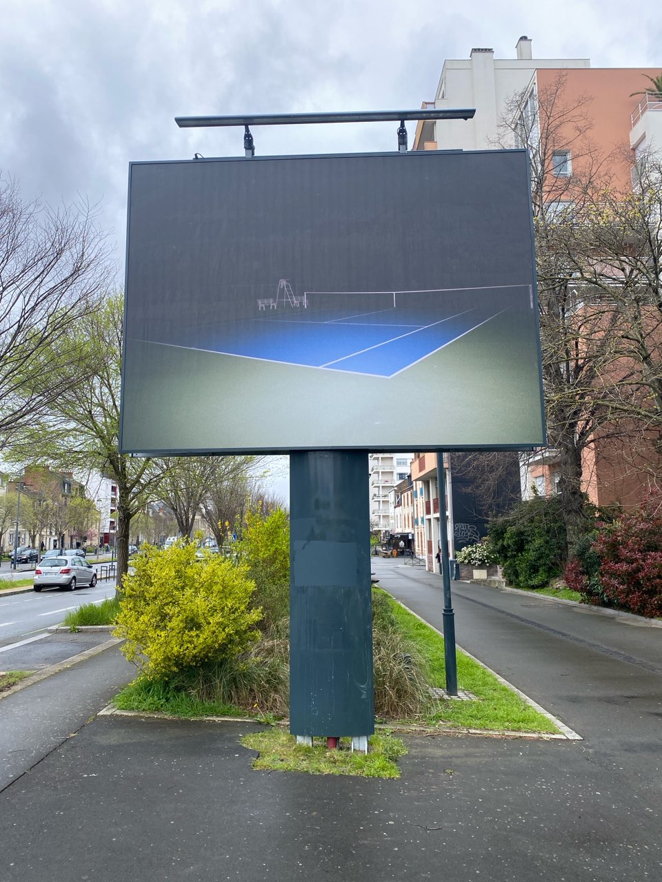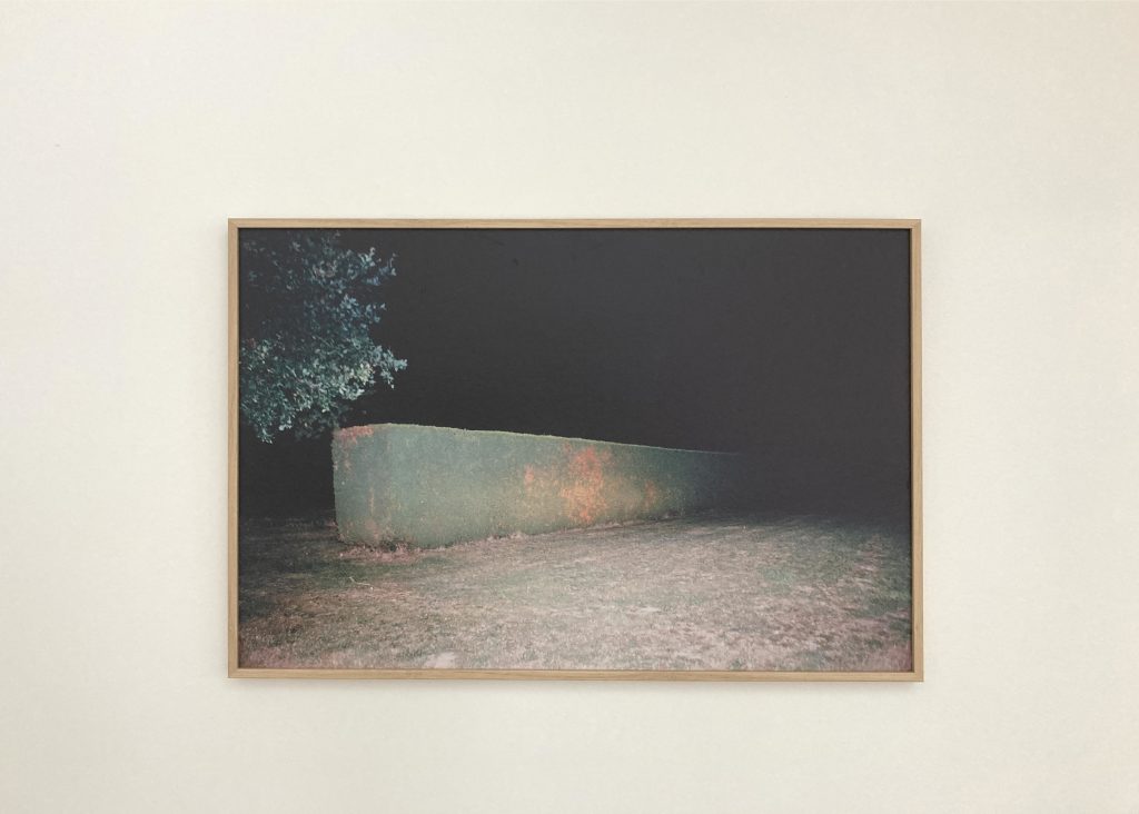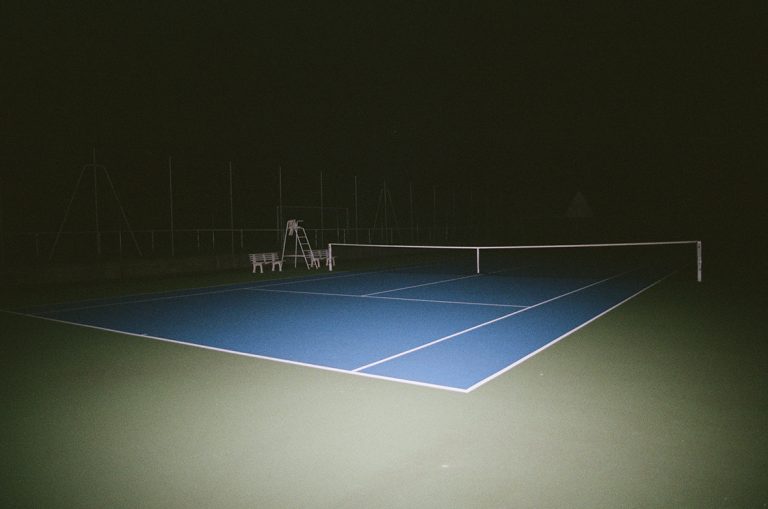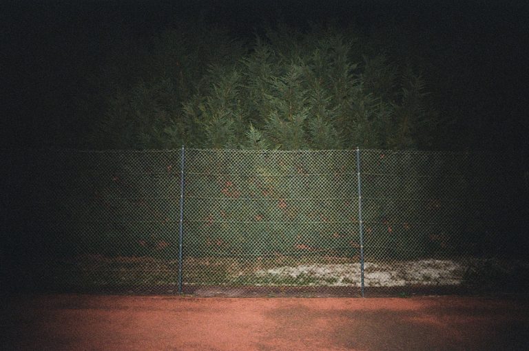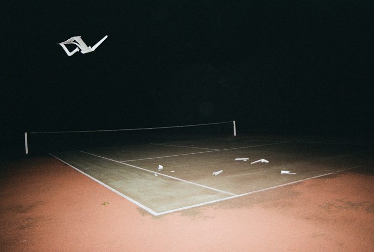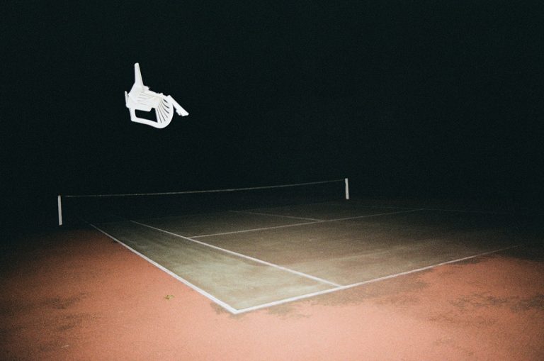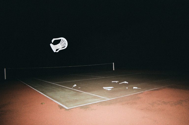 Vivant en milieu rural depuis une dizaine d’année, je me suis rapidement intéressée aux structures de loisirs présentes de manière récurrente autour de toutes les petites communes environnantes. Ces espaces, qui, la journée, ont pour vocation à mettre en avant le dynamisme de la population locale et sa soif d’exercice, se transforment la nuit en des lieux inutiles et inquiétants. En y glissant une action incongrue, comme jeter une chaise de jardin en plastique sur un terrain de tennis désert, je mets en scène une révolte sourde et sous-jacente